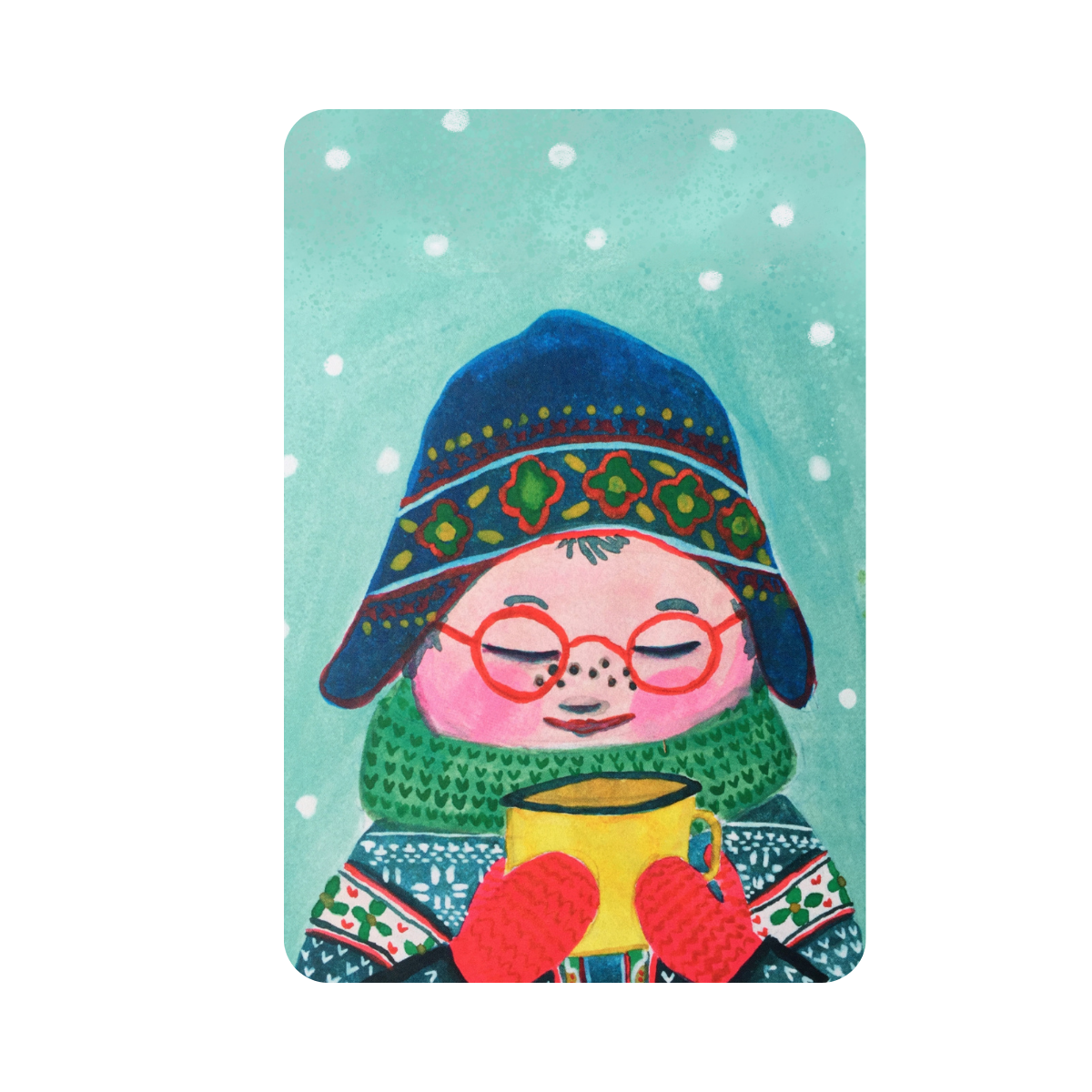 WARME CHOCOLADEMELK Op deze A6 winterse kerstkaart staat een knusse afbeelding van iemand in gebreide trui en gebreide muts met een emaille beker warme chocolademelk. Deze winterse kaart heeft geen tekst. Deze duurzame kerstkaarten zijn uitgevoerd met ronde hoeken en worden gedrukt op papier gemaakt van landbouwafval.
